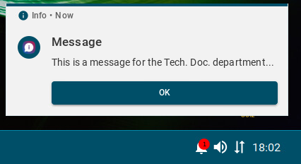 On the device, the message is displayed in a Message window, and, if not closed, also in the Notification Center. For details, see How to Start with IGEL > IGEL OS Notification Center.