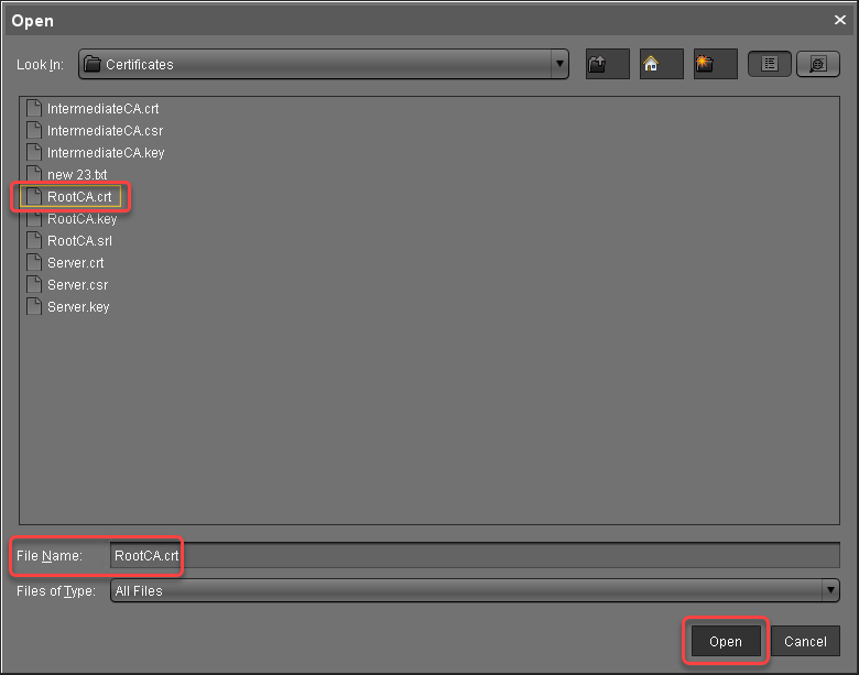 select the root certificate file, and click Open.