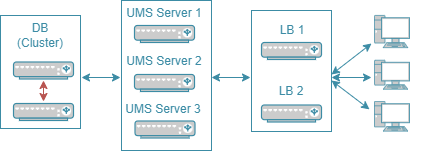 In this configuration, each of the two servers can also perform the tasks as a UMS Server alone. If both servers are active at the same time, this has a load-distributing effect. Note, however, that the load balancer generates extra load along with the actual UMS Server.