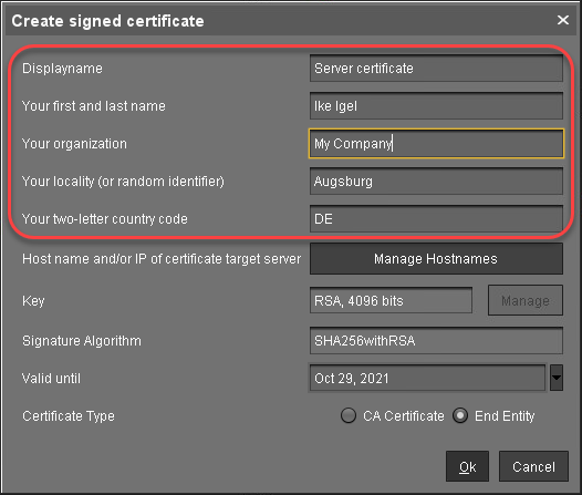 In the dialog Create Signed Certificate, fill in the data as required.