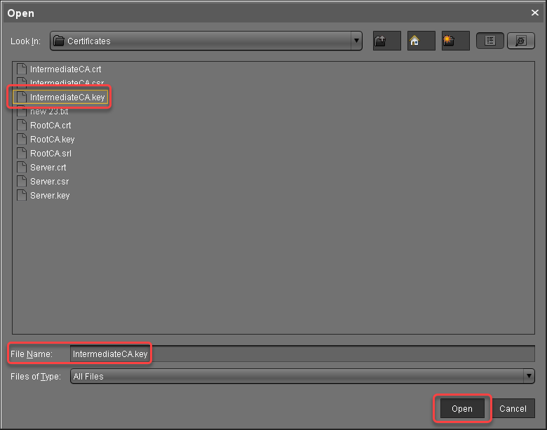 Select the private key file of the intermediate certificate and click Open.