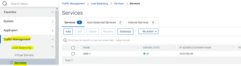 The UMS server backend must be configured as Service under Traffic Management > Load Balancing > Services.