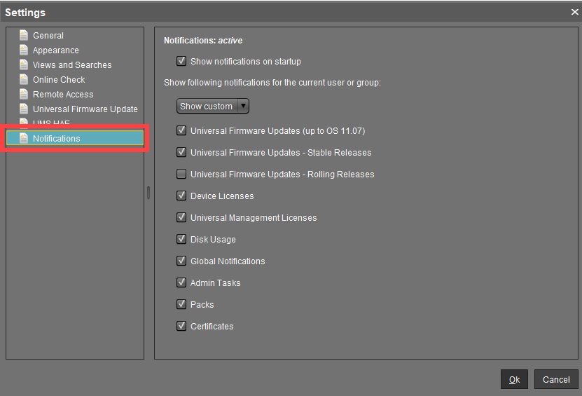 To view notifications generated by UMS version below 6.10.110, leave the feature Universal Firmware Updates (up to 11.07) activated.