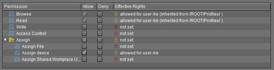 A user can only assign a device to a profile or delete this assignment. He cannot make any changes to the device or profile, i.e. he cannot rename, delete the device or profile, or edit their configuration.
