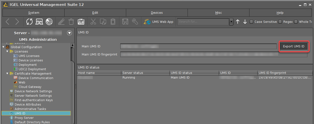 The IGEL Universal Management Suite (UMS) ID is used, for example, for the communication of your UMS with the IGEL Cloud Services. The UMS ID also enables communication between the UMS and the IGEL License Portal (ILP). Follow the steps below to export the UMS ID to a certificate file from the UMS Console or the UMS Administrator.