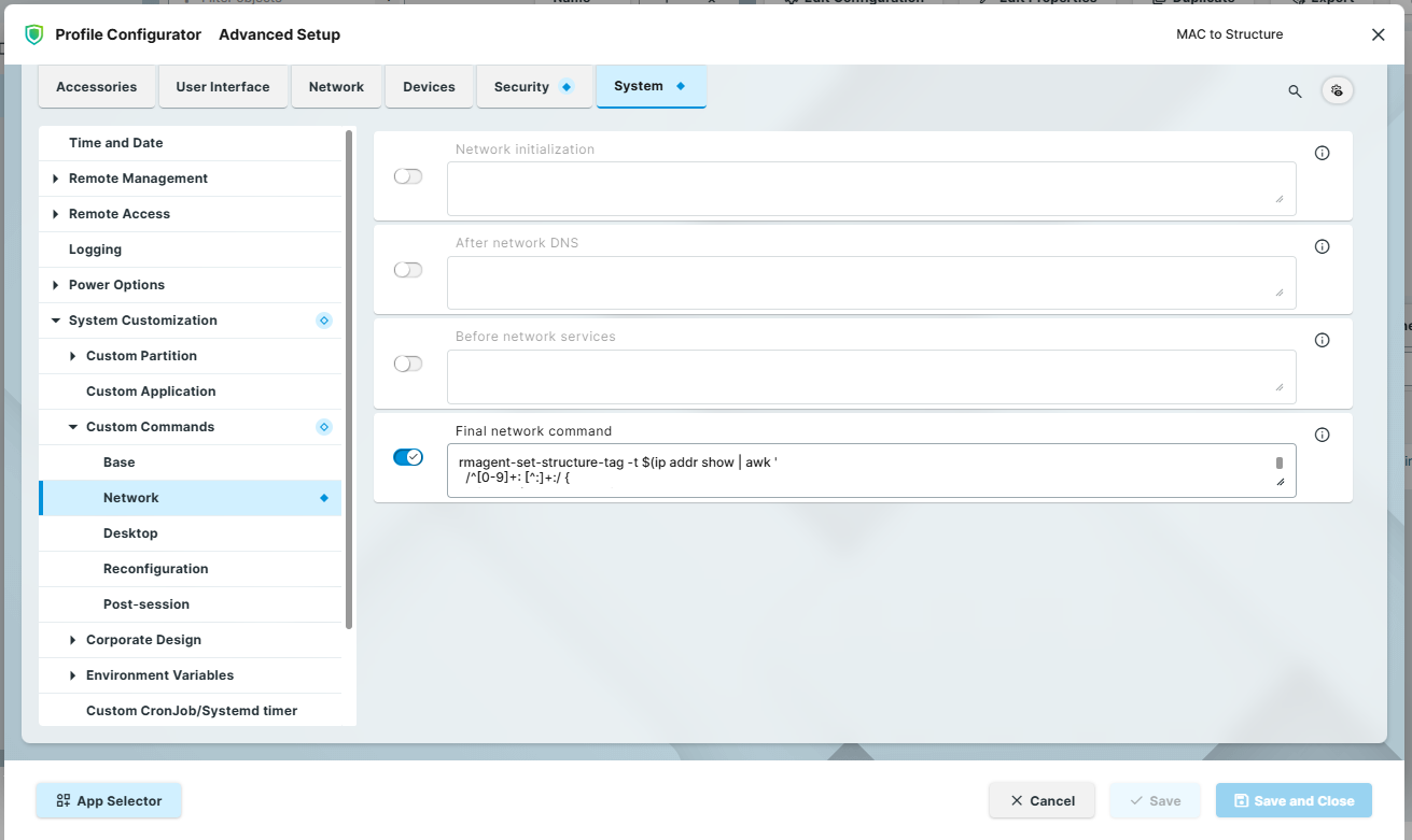 Enable the field Final network command and enter the following script into it: