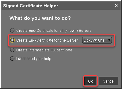 In the Signed Certificate Helper, select Create end certificate for one server and select the server which is to be assigned to the certificate.