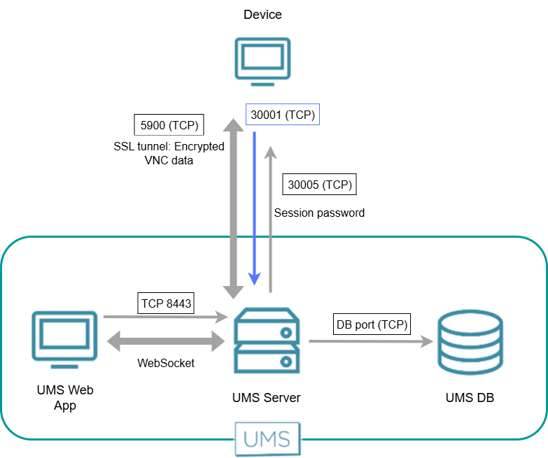 The VNC data is sent through the opened WebSocket tunnels between the UMS Console and the UMS Server and between the UMS Server and the Device.