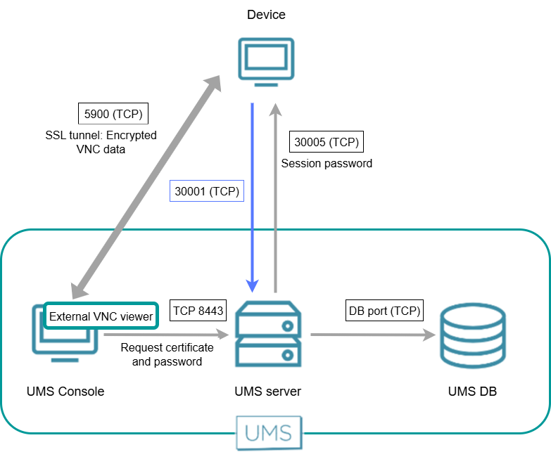 The external VNC viewer runs on the same machine as the UMS Console. The UMS Console starts the external viewer and then acts as a proxy between the device and the external VNC viewer.