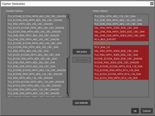 Set active: Add the cipher selected in the Inactive Ciphers list to the list of active ciphers.