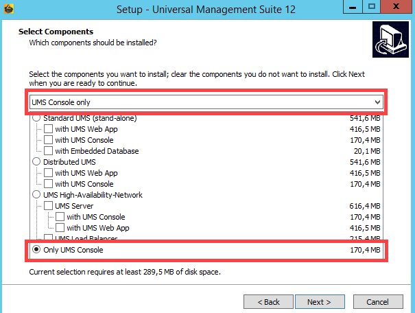 If there are already other UMS components installed on the client machine, the Only UMS Console option will be deactivated and, thus, cannot be selected for the installation.