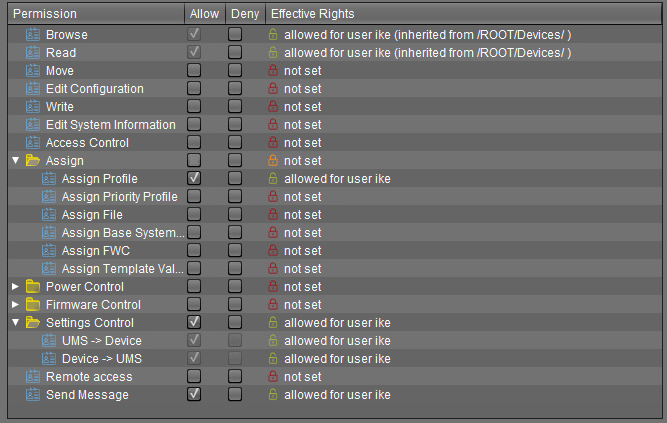 A user can only assign a device to a profile or delete this assignment. He cannot make any changes to the device or profile, i.e. he cannot rename, delete the device or profile, or edit their configuration.